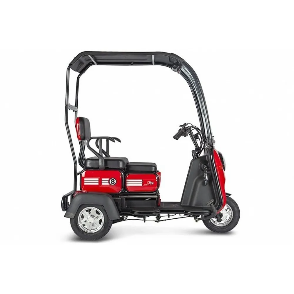 Модель рассчитана на 2-х ездоков, один из которых является пассажиром. Обустроена широкими мягкими сиденьями. Пассажирское оснащено большой спинкой и подлокотниками. При грузоподъемности 120 кг модель может одновременно перевозить взрослого и ребенка. Наличие лобового стекла и крыши повышает уровень комфорта при передвижении при неблагоприятных погодных условиях.