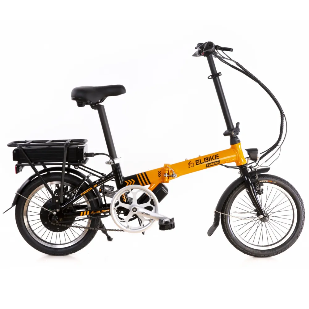 ЭЛЕКТРОВЕЛОСИПЕД ELBIKE POBEDA – идеальный вариант подарка на мероприятие любого рода, места подростков и взрослый. Компактный эргономичный велосипед грузоподъемностью до 110 кг, прост в использовании и обслуживании. Складывающаяся модель легко транспортируется, не вызывает проблем с хранением техники. Привлекательный дизайн в желто-черных тоннах и технические особенности делают модель заметной на фоне других. Купить транспортное средство выгодно, без посредников и наценок предлагает наш интернет-магазин.