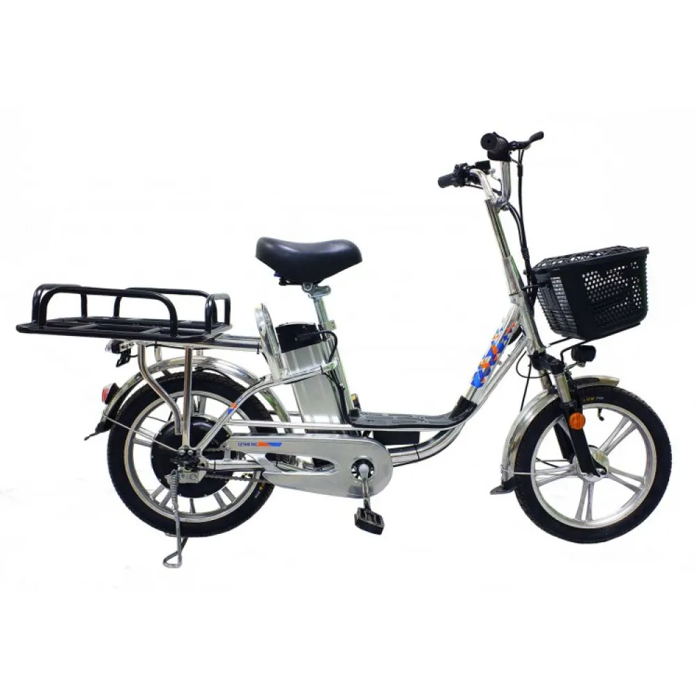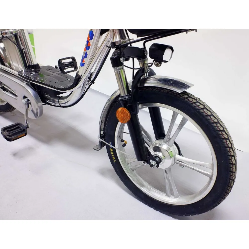 Техника имеет мощность – 350 Вт, надежную тормозную систему, не требующую применения силы. Качественный АКБ позволяет разгоняться до 35км/час и ехать на одной подзарядке до 40км. На этапе производства электровелосипеда производители позаботился об удобном мягком сидение, снижающим нагрузку на позвоночник, снимающим усталость со спины.